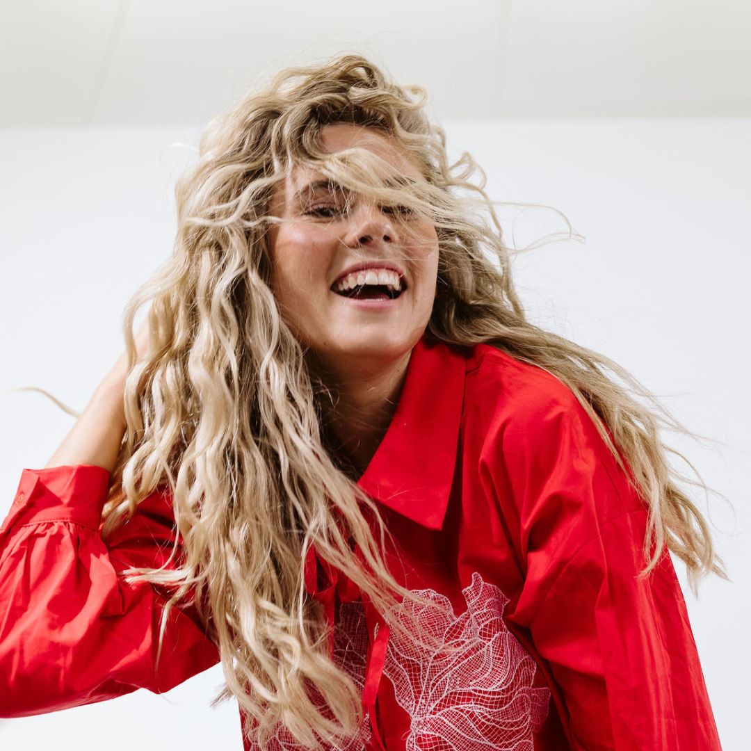 Blonde curly girl holding bottles of curl cream