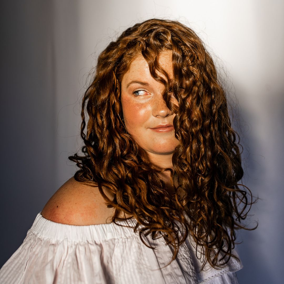 Red head holding curly hair shampoo