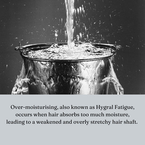 Over-moisturising, also known as Hygral Fatigue, occurs when hair absorbs too much moisture, leading to a weakened and overly stretchy hair shaft.