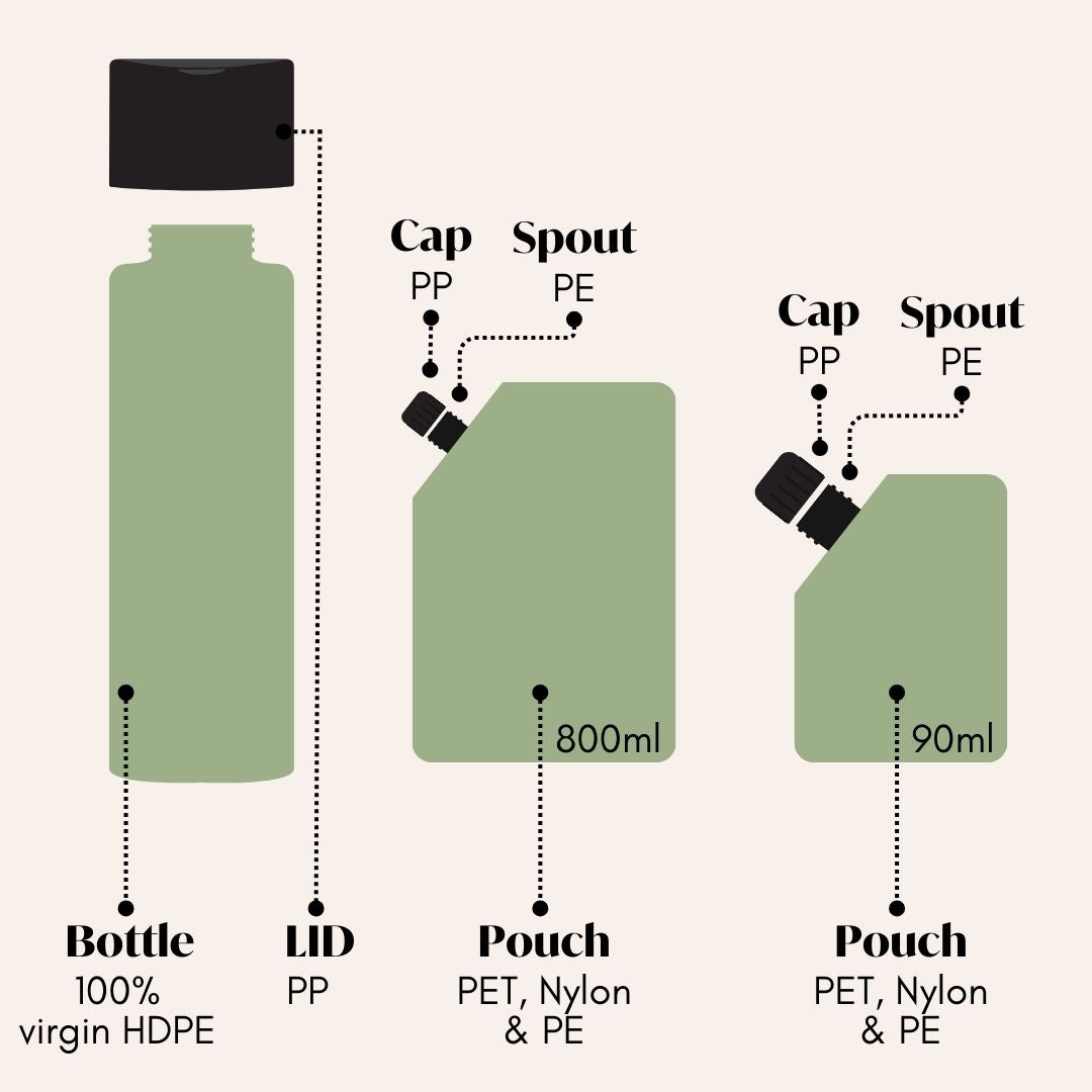 All of our bottles are made from recyclable materials that can be taken to your local Recycling Depot or placed in your Yellow Bin.